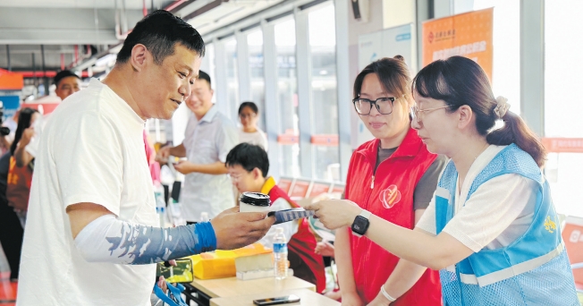 7月30日,琴川街道衡山社区联合城市基层党建示范带成员单位在常熟站开展“凝‘新’聚力 清凉一夏”关爱活动,为新业态新就业群体送上清凉问候。