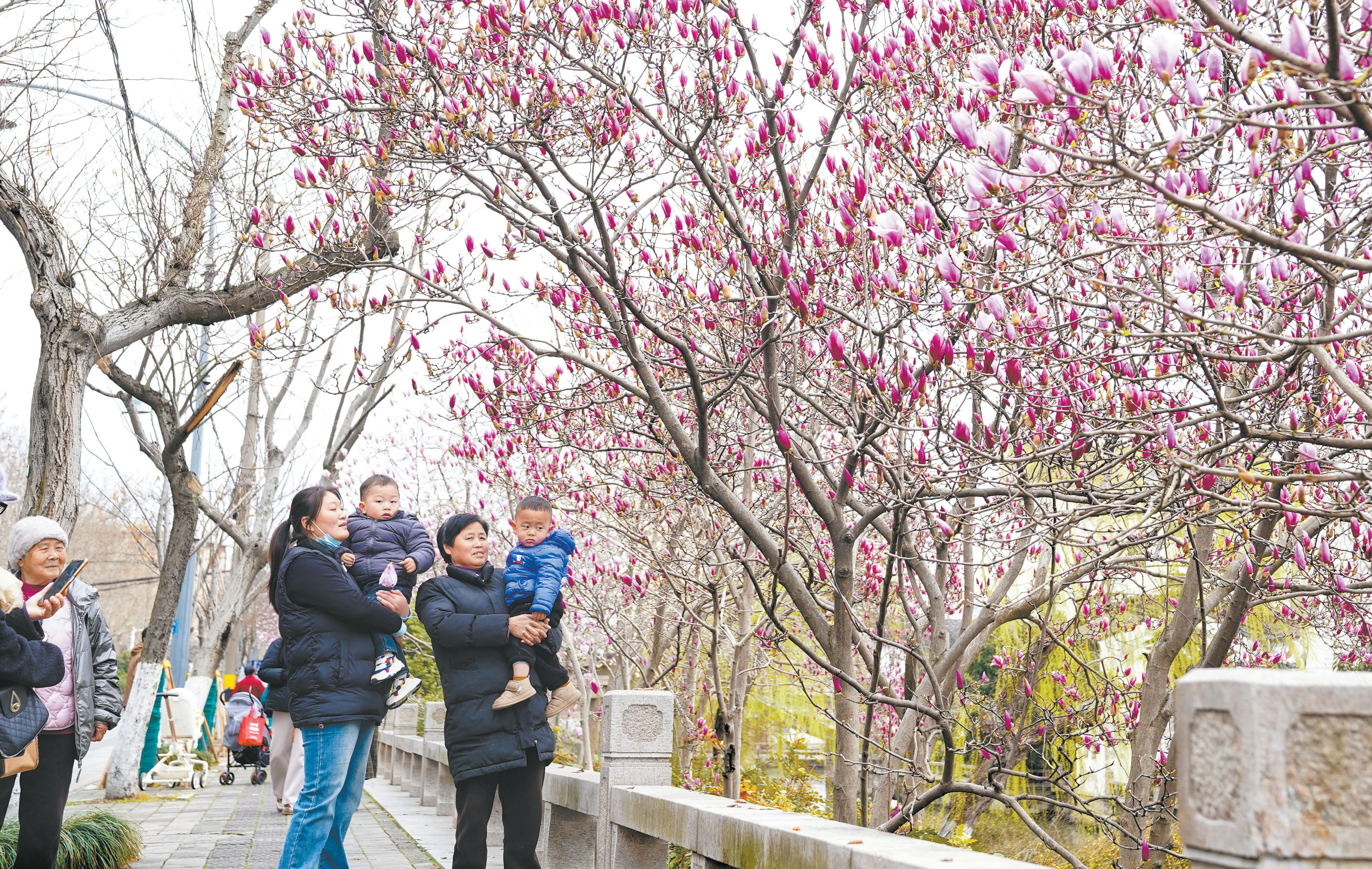 连日来,护城河畔的玉兰花竞相绽放,紫色的花朵缀满枝头,吸引了众多市民前来赏花拍照,感受春天的气息。