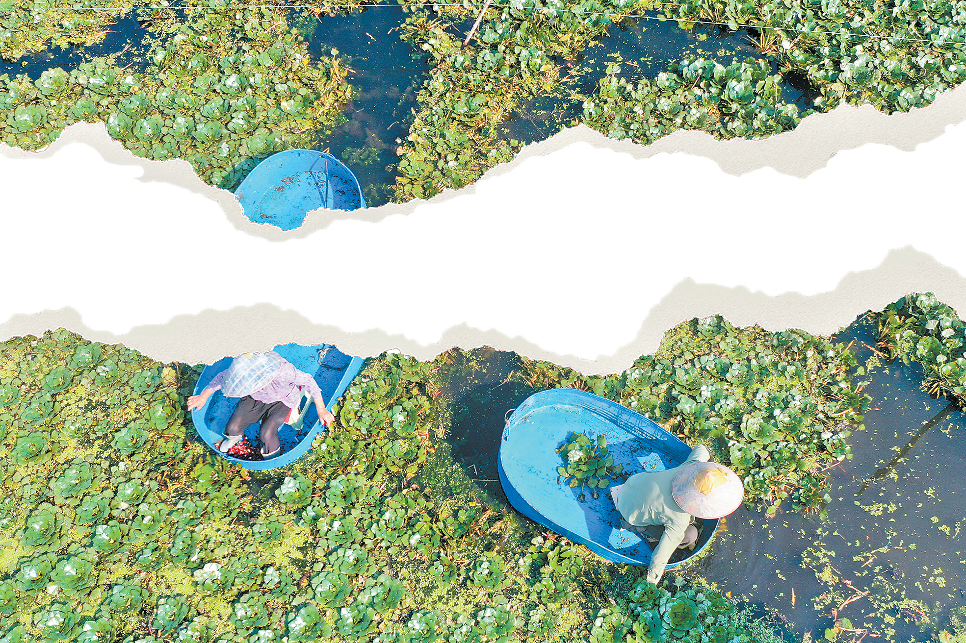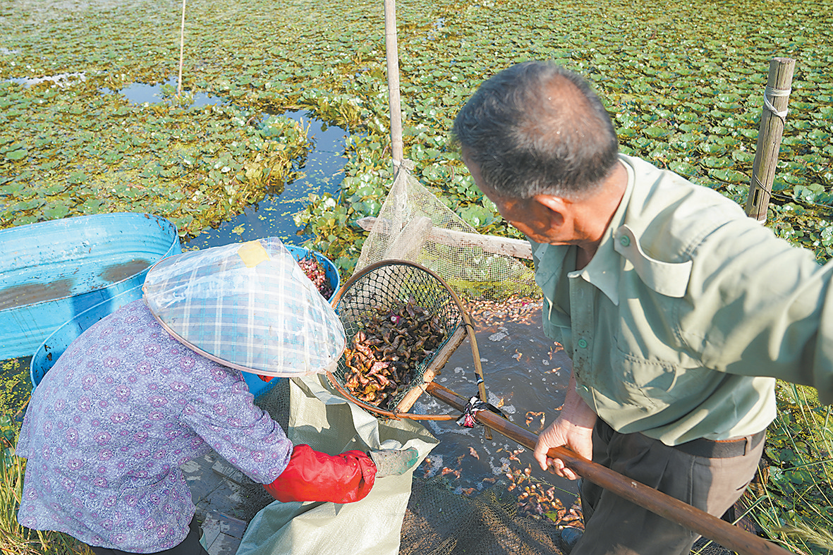 9月4日凌晨5时许,趁着露气还未散去,古里镇芙蓉村种植户高锦华和老伴儿头戴草帽、脚蹬套鞋,坐上菱桶开始了当天的采摘。蓝色的菱桶像小船一样划开水面,绿得发亮的菱叶层层叠叠铺在水面上,采菱人屈膝坐在桶里,手臂探进水中,熟练地翻起菱叶,菱叶上的露珠“嗒嗒”落入水中,红色的菱角就藏在菱叶底下。捏住菱角轻轻一扯,连着细茎的菱角便落进了桶中。“咔嚓”一声脆响,掰开菱角,嫩白的菱肉裹着水汽散发出清香,咬上一口,鲜甜脆嫩、生津解渴。