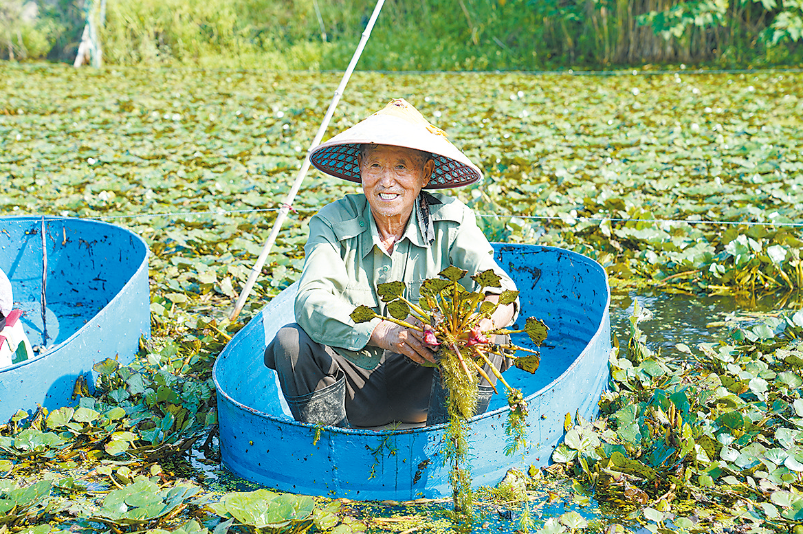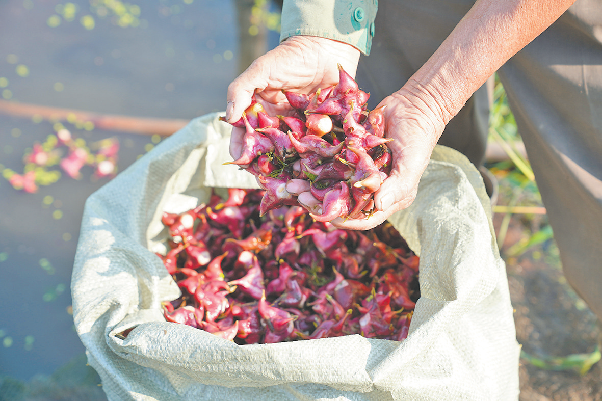 高锦华已有10多年的种菱经验,他在当地承包了约5亩水面种菱。考虑到本地和周边地区市民的喜好,他在池塘里种了四个角的红菱和两个角的凹菱。前者肉质鲜嫩,以生吃为主;后者一般烧熟后食用,口感软糯。每年4月的头10天,他会在池塘里均匀地放下菱苗,然后定期清理塘内浮萍、水绵等水生植物,精心管理,给菱角生长提供充分的空间和养分。老高说,红菱的生存和繁殖能力很强,成熟的菱角如果不及时采摘,就会掉落到河底。每年红菱先成熟,7月下旬就能上市。今年由于雨水偏少,红菱的产量比往年低一些,个头也偏小,但口感依旧清甜。老高和老伴儿一天最多可以采250公斤菱角,目前这些菱角主要销往上海、苏州等地,红菱和凹菱的价格都在每公斤7元左右。为了让顾客品尝新鲜的时令美味,他特意根据收购时间进行采摘,每天凌晨5时多下水作业,采完立即装车送往市场。