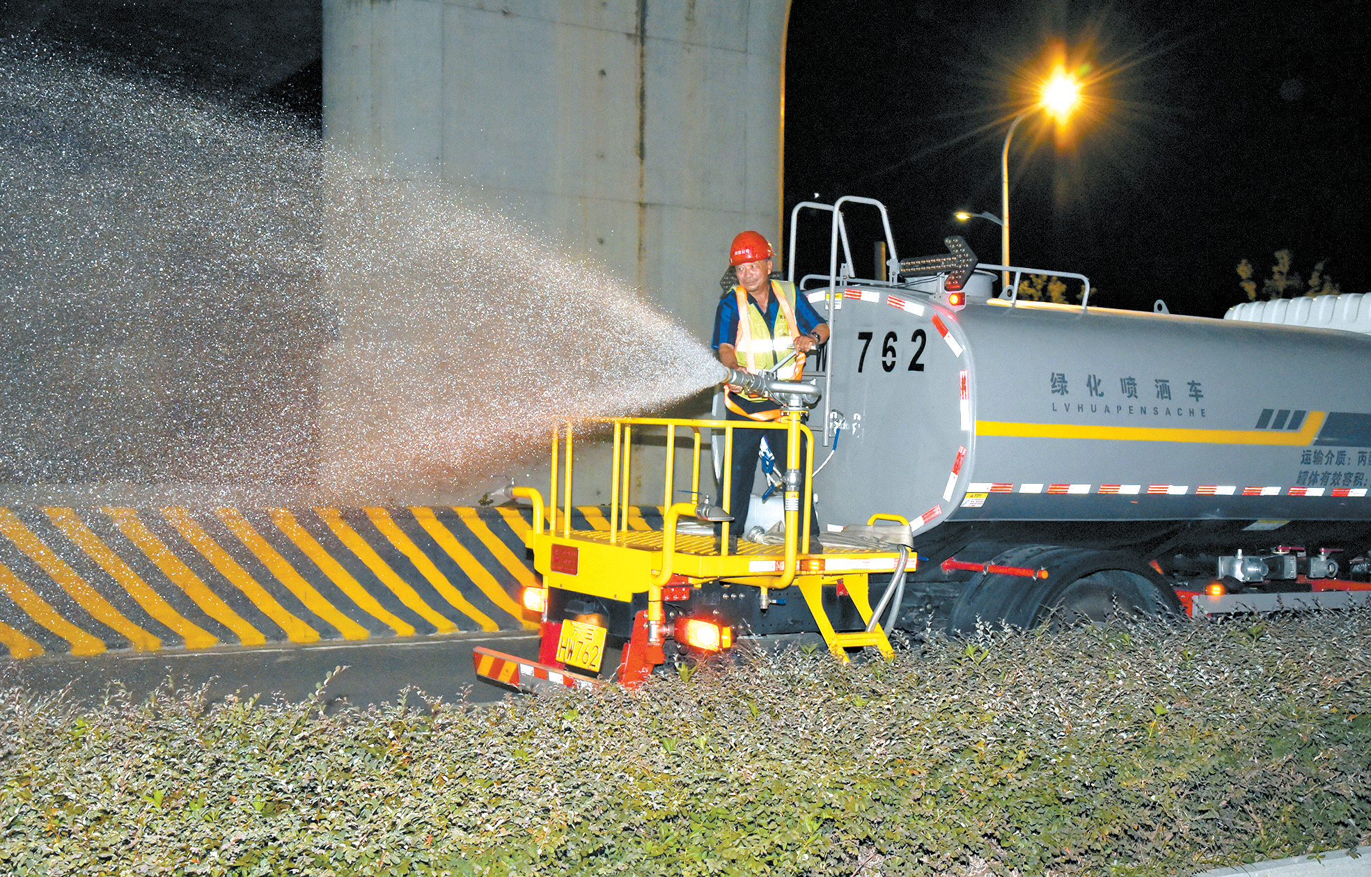 市城市绿化管理处打好抗旱保绿攻坚战,利用夜间气温降低、水分蒸发减少时进行浇水作业,确保绿化树木正常生长。