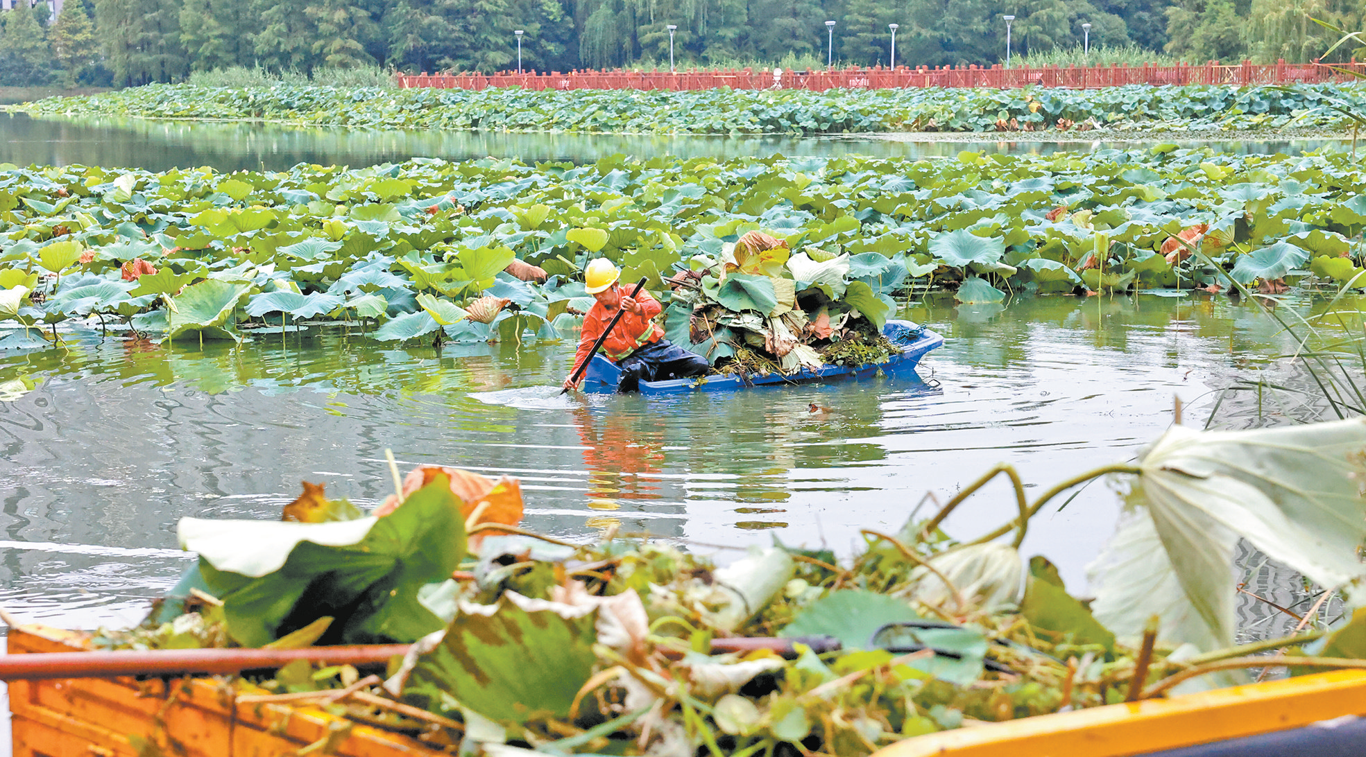 日前,市政部门组织工作人员对富春江西路附近河道内的水生景观植物进行修剪养护,同时清理河道漂浮物,维护整洁的河道环境。
