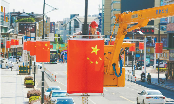 图:工作人员正在方塔街悬挂五星红旗。