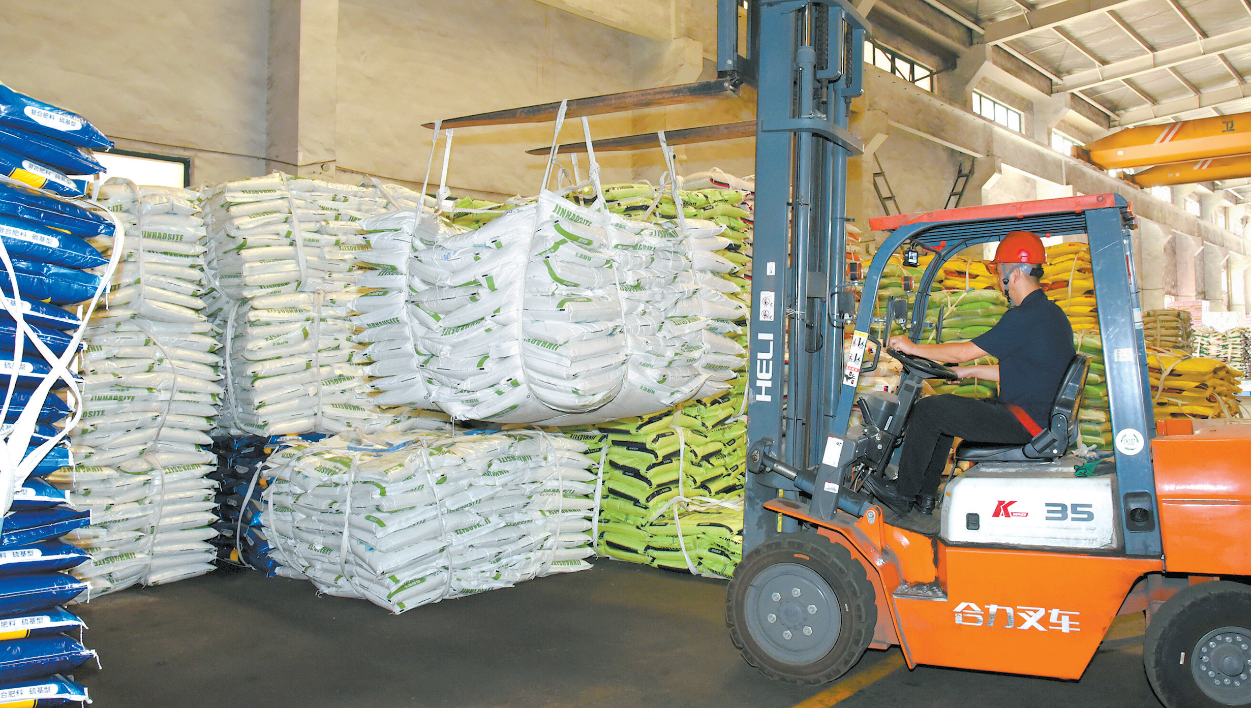 连日来,市供销合作总社积极组织货源,加紧储备农药、化肥,确保全市农业作业顺利开展。图:农资储备库工作人员正在装卸化肥。