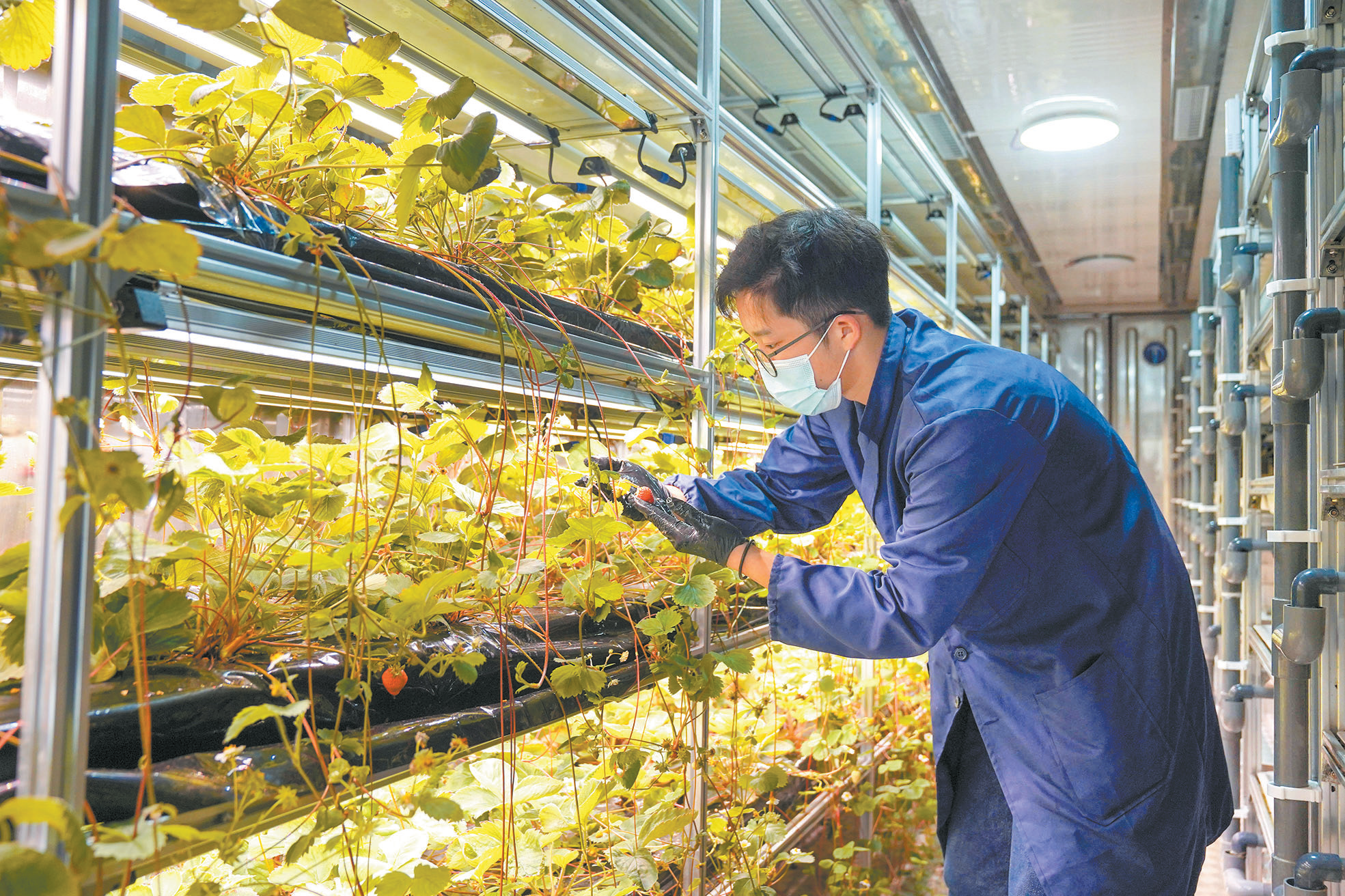 日前,在常熟国家农业科技园区,南大(常熟)研究院有限公司的技术人员正在现代化植物工厂内开展草莓田间管理工作。图:工作人员仔细检查草莓的生长状况,调整光照、湿度及营养液参数,确保作物在最优环境中生长。