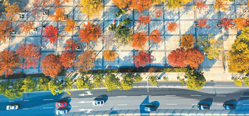 秋末冬初,树木披上了多彩的“衣裳”,为虞城增添一抹诗意的色彩。图:图书馆前广场树木颜色丰富多彩。