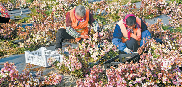 图:工作人员抢抓晴好天气,在菊田内采摘、分拣盛开的菊花。