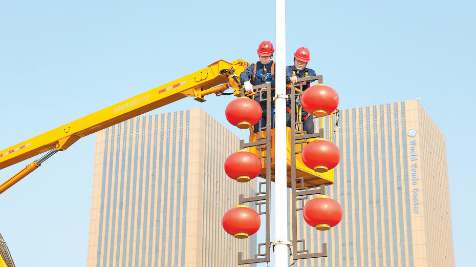 日前,市住建局公用处路灯养护所组织工作人员给市区各个主干道上的路灯挂上喜庆的红灯笼,为虞城增添新春气息。