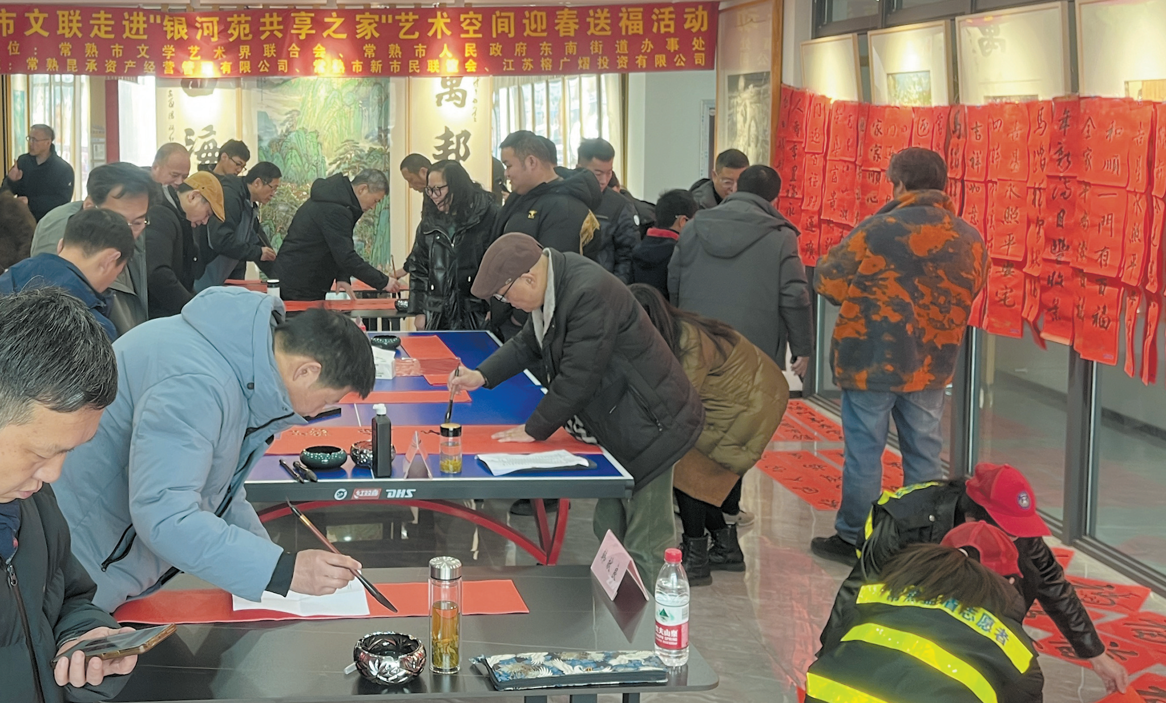 2月1日,东南街道办事处“银河苑共享之家”艺术空间室内暖意融融、墨香四溢。市文联和东南街道邀请8名书法家开展迎春送福活动,将年味和新春祝福提前送到居民家门口。图:活动现场。