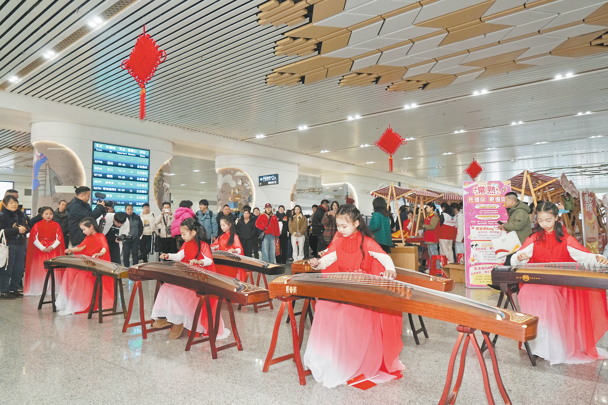 9时30分许,随着激昂旋律的响起,特色文艺表演精彩上演。民族乐器合奏气势恢宏,少儿古筝演奏婉转悠扬,街舞表演动感十足……候车大厅瞬间化作了欢乐的舞台,欢声笑语温暖了漫漫归乡路。