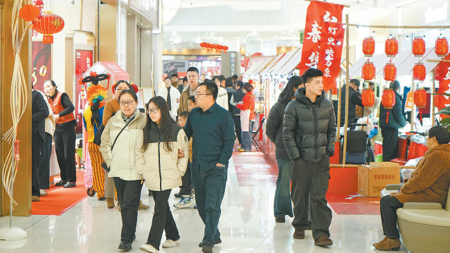 春节假期,本市各商业综合体、超市推出各类促销和年俗文化活动,营造浓浓年味。图:春节里的永旺梦乐城。