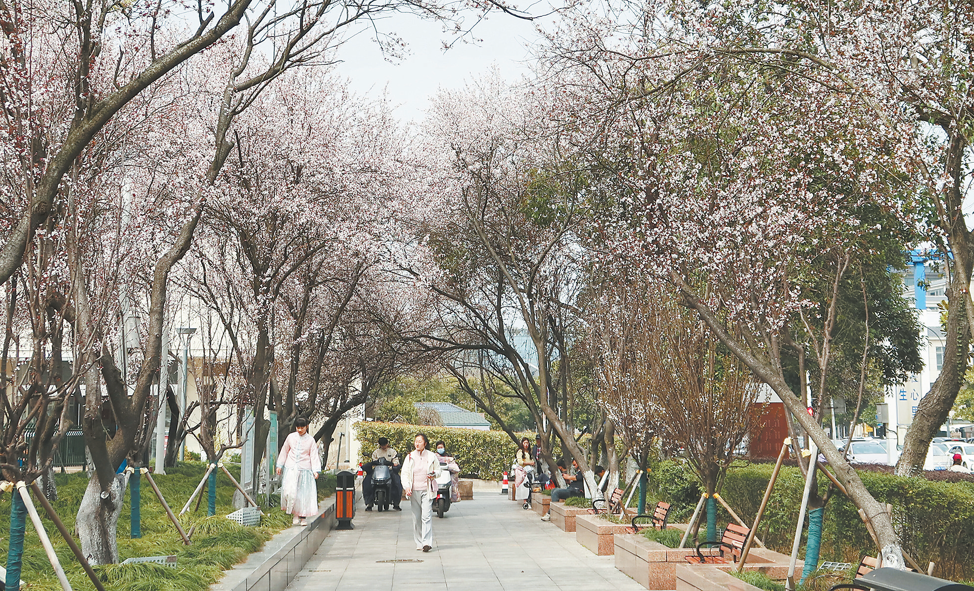 常熟图书馆前红叶李竞相开放,成为虞城市民春日赏花的打卡地。图:市民穿梭在红叶李“隧道”下。