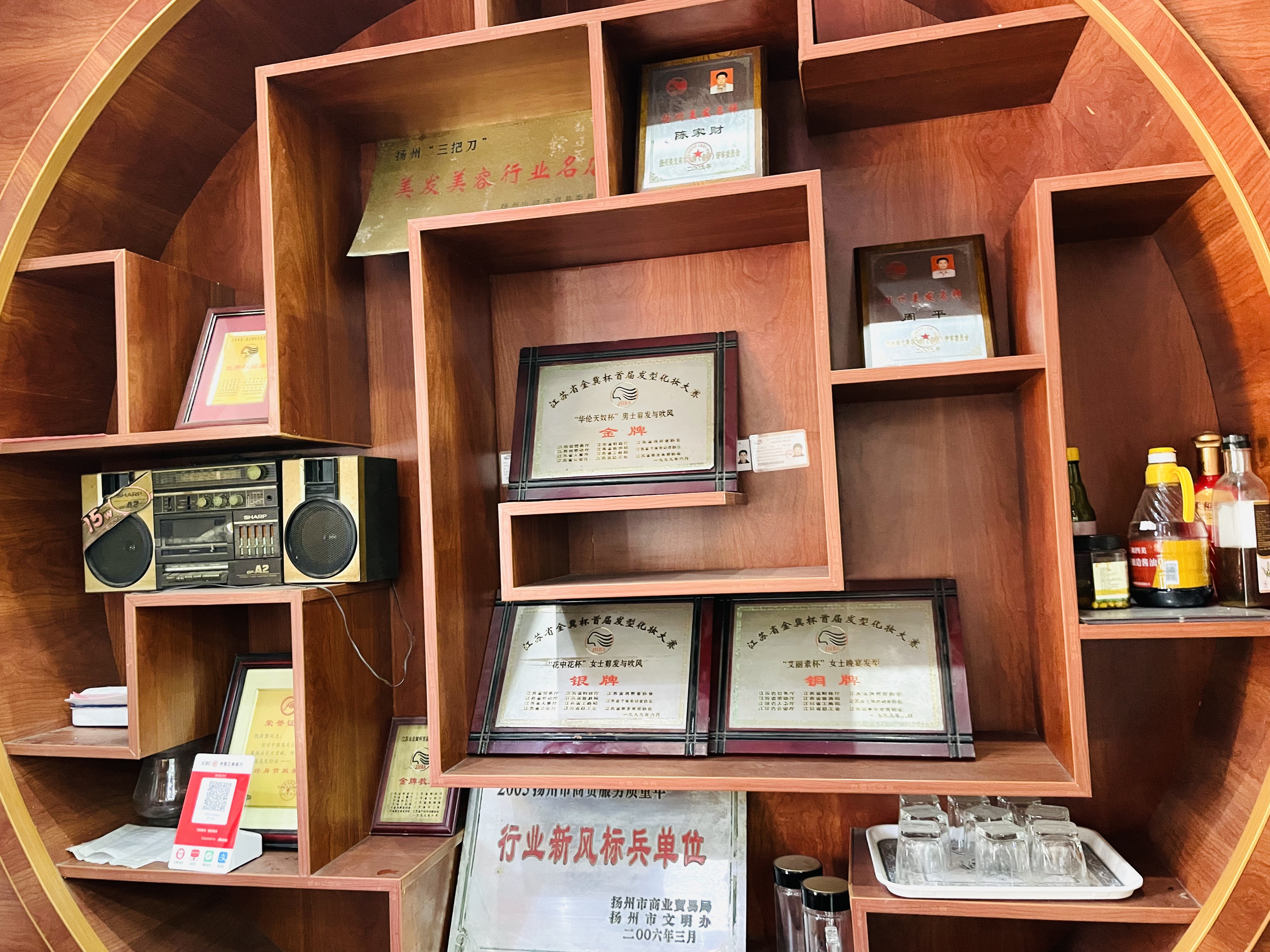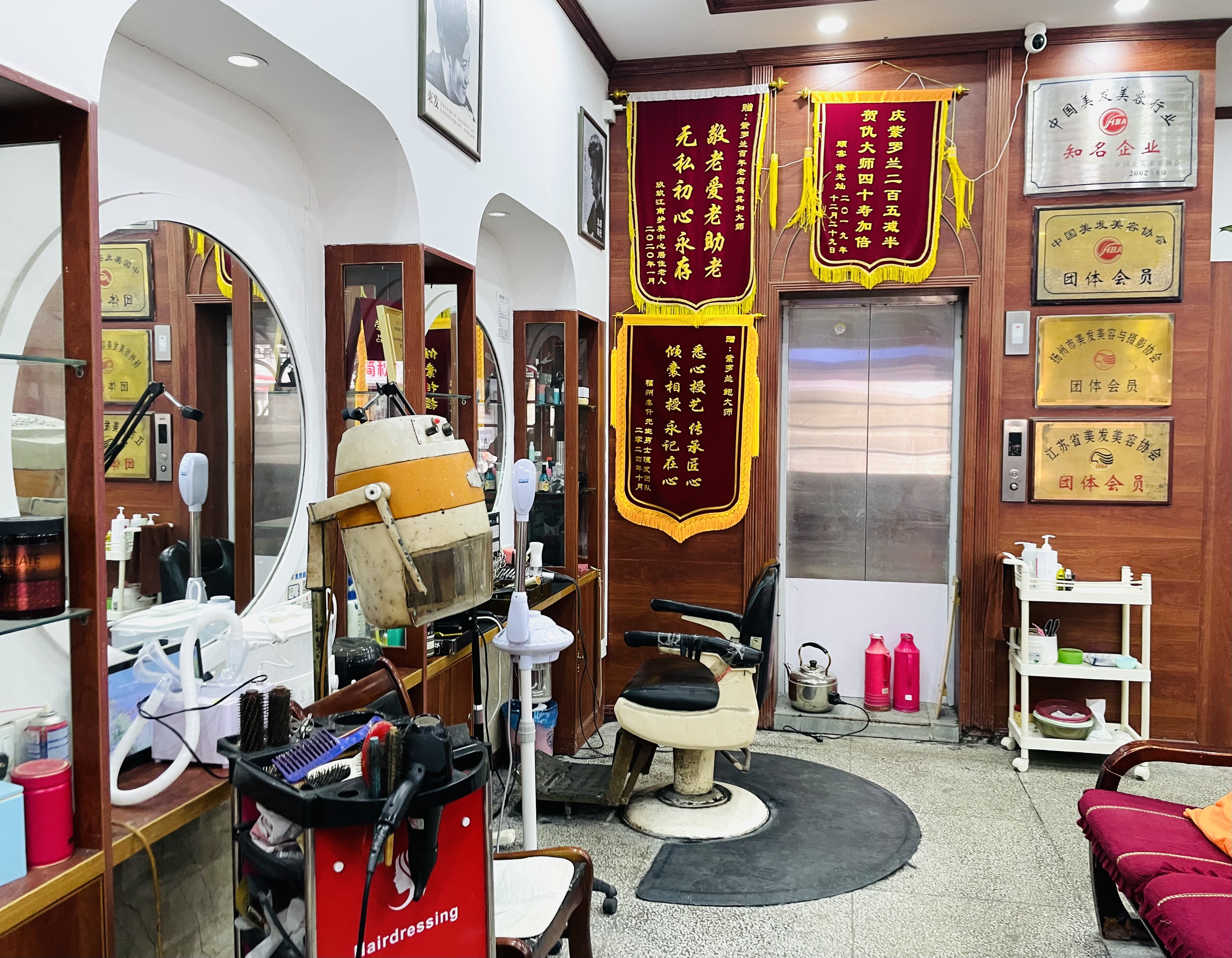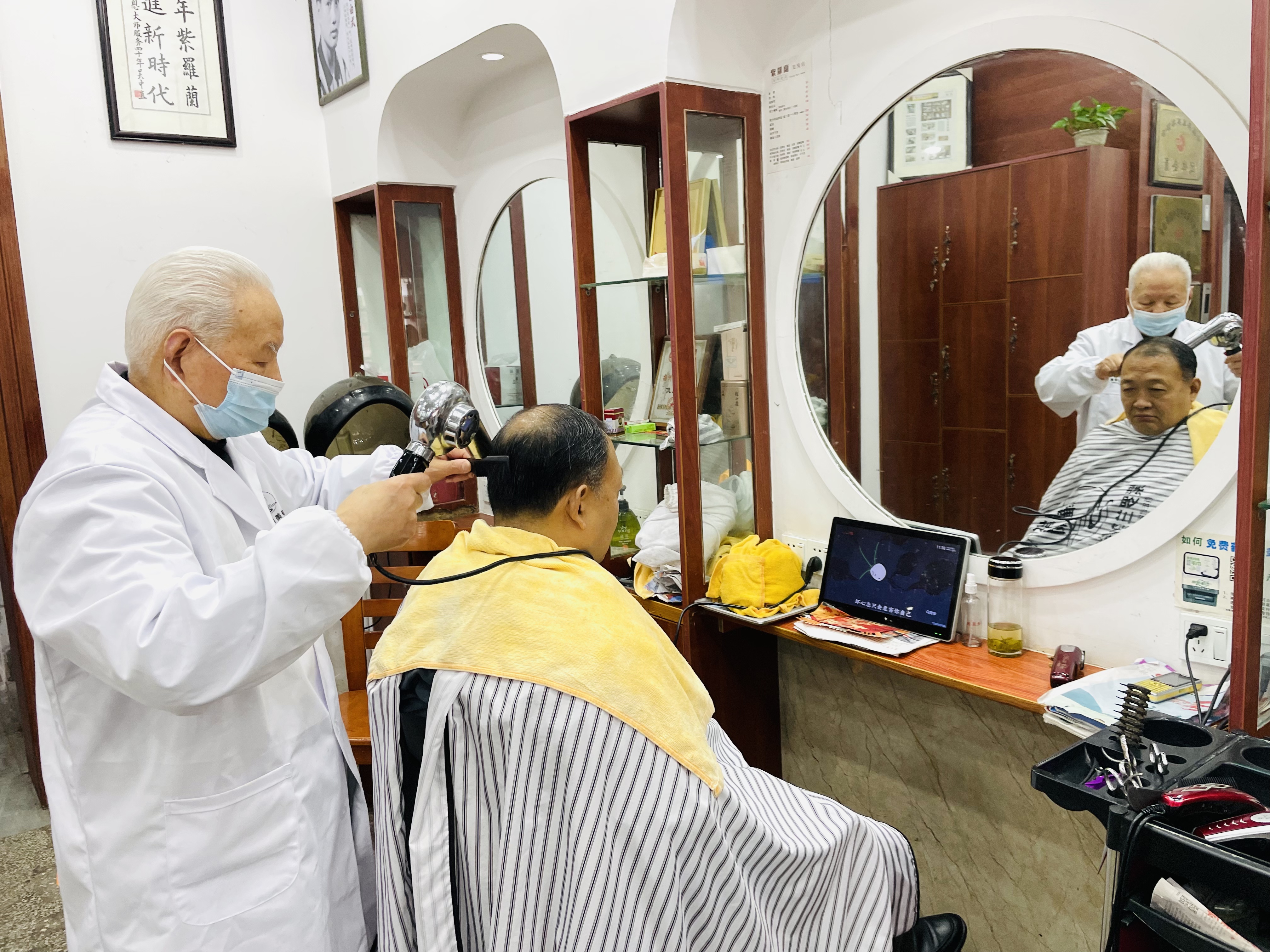 虽然大致风格复古,店里还是在不断“上新”美发工具。客人坐下来,面前还有一块平板电脑滚动播放扬州的宣传视频。“刚刚消费的顾客在网上给我们好评了。”理发师鲍玉贞高兴地向记者展示网络预约流程。目前在紫罗兰美发厅从业30年以上的理发师有7人,平均年龄70岁。对于店里其他理发师而言,52岁的鲍玉贞玩网络算比较熟练的了。她说:“我现在每天尝试做直播,想让更多人了解我们的行业和技艺,将品牌传承下去。”最近,鲍玉贞找到吸引年轻人的方式,通过参加近期举办的“益起来·益精彩”扬州市美业爱心驿站项目,紫罗兰美发厅为快递小哥等户外劳动者提供爱心理发服务,还能为理发技艺求职者提供培训和就业岗位。