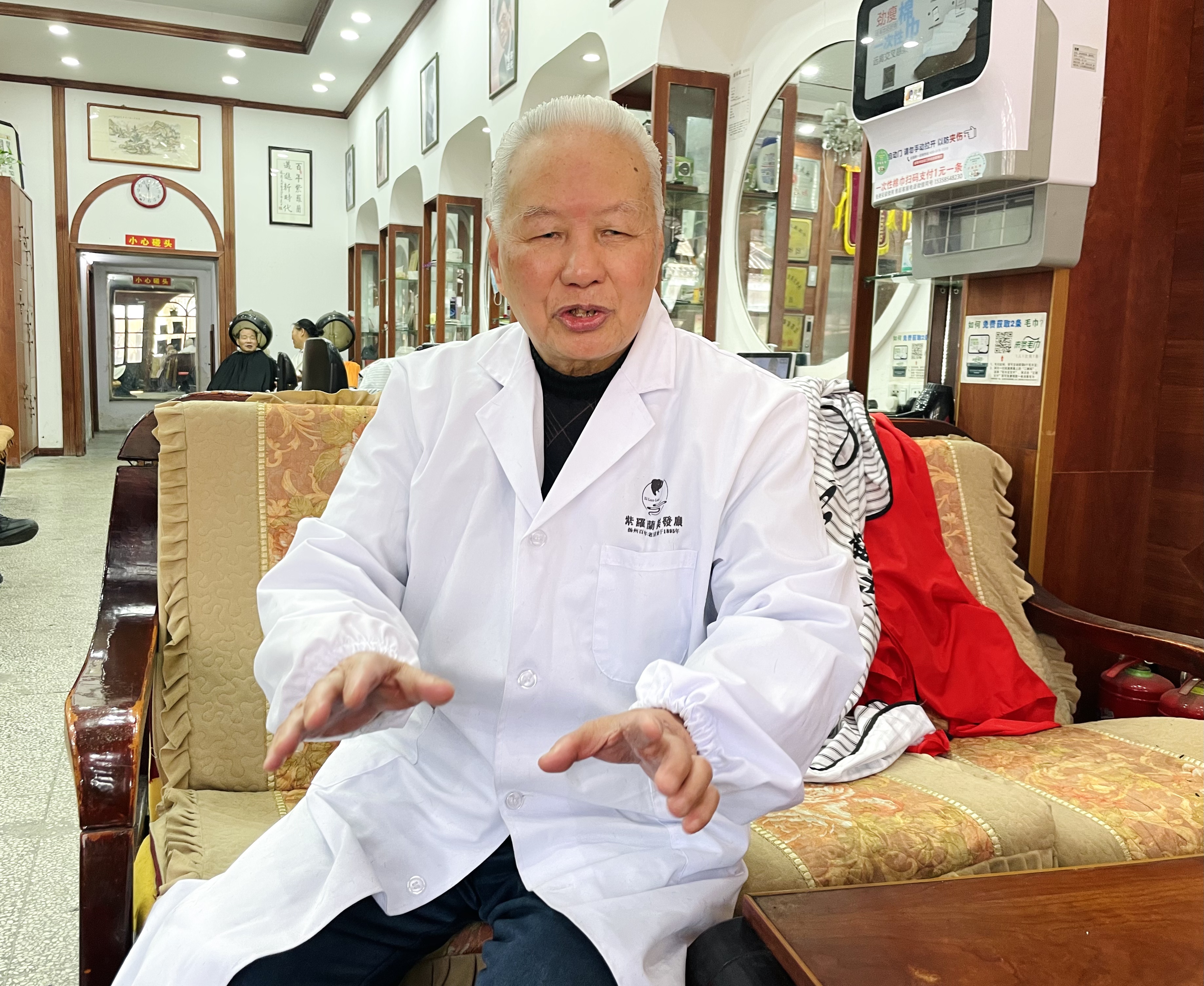 暖阳倾泻,已经85岁的仇老忙得一刻不停,从15岁学徒到目前已经他工作了70年,仍然坚持每天公交加步行上班,“早七晚六”成为日常。在去年11月中国(南昌)国际美发美容节上,仇老现场表演“扬州72刀半修面技艺”惊艳四座,被评为中国美业“凤凰奖”匠心传承功勋人物。仇老现在每天也在思考如何将技艺和品牌传承下去。“我有很多徒弟到外地开店,把‘紫罗兰’品牌做得红红火火,现在店里几位师傅也非常努力。我在身体好的时候会一直做下去,这本身就是一种传承。”仇老说。