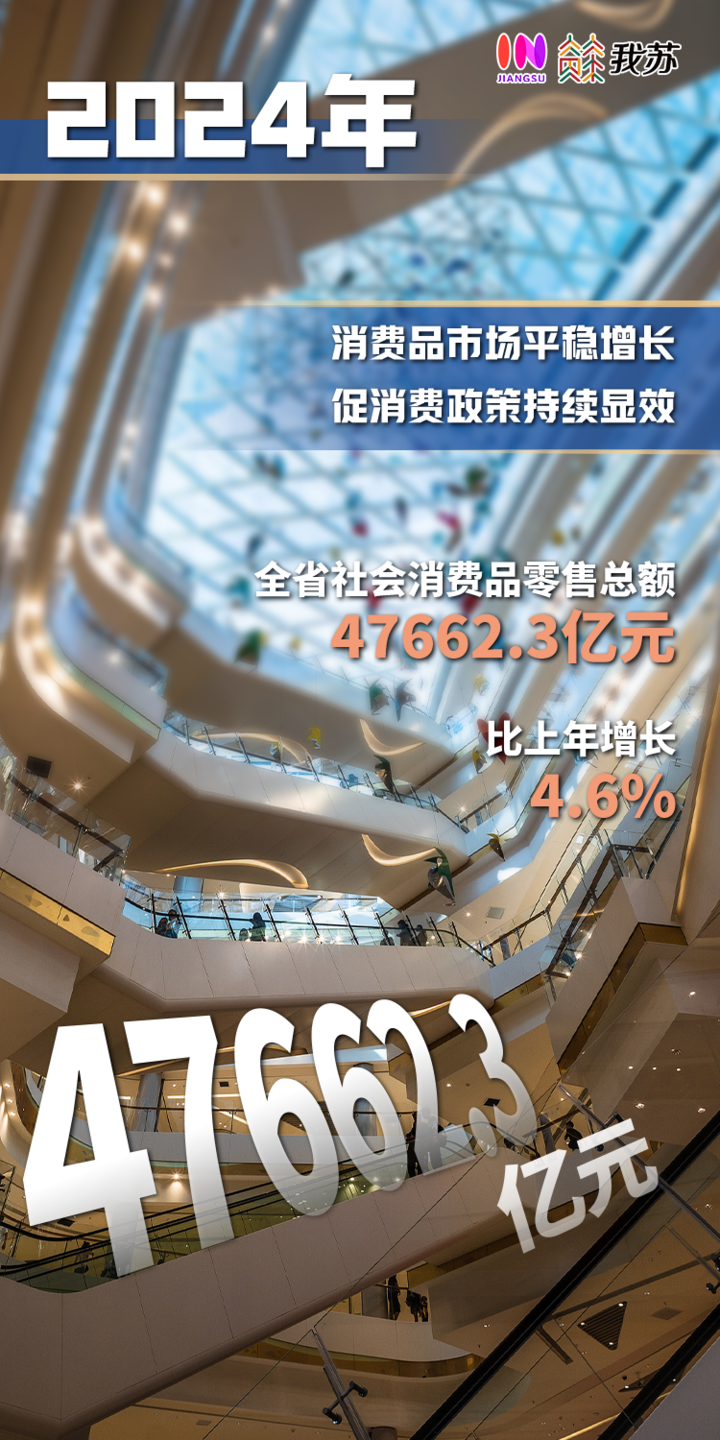 消费品市场平稳增长,促消费政策持续显效。2024年,全省社会消费品零售总额47662.3亿元,比上年增长4.6%。在消费品以旧换新政策的带动下,限上家用电器和音像器材类商品零售额同比增长15.1%,其中能效等级为1级和2级的绿色家电增长40.7%;汽车类商品零售额增长2.1%,累计增速连续4个月回升。