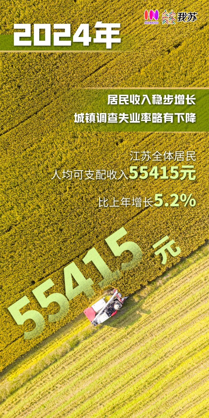 居民收入稳步增长,城镇调查失业率略有下降。2024年,江苏全体居民人均可支配收入55415元,比上年增长5.2%。全省城镇调查失业率为4.5%,比上年下降0.1个百分点;四季度,全省城镇调查失业率为4.4%,比三季度下降0.2个百分点。