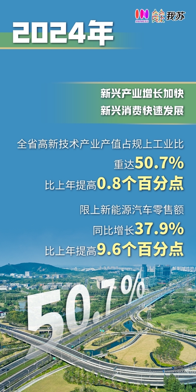 新兴产业增长加快,新兴消费快速发展。全省高新技术产业产值占规上工业比重达50.7%,比上年提高0.8个百分点;规上高技术制造业增加值同比增长9.1%,比上年加快6.3个百分点,对规上工业增长的贡献率达27.8%。限上新能源汽车零售额同比增长37.9%,占汽车类商品零售额比重达35.3%,比上年提高9.6个百分点;可穿戴智能设备零售额增长91.8%。