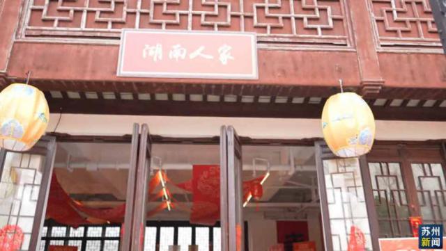最近苏州最有年味的地方就是唐寅故居文化片区,一路走来可以看到建筑物上,很多都写上了像是“福建人家”、“云南人家”还有“四川人家”等等的字样,这也是以中国春节习俗“串门”为一个线索来打造出了一个沉浸式的过年的体验空间。在湖南人家进来就能看到,在这样一个空间内是把当地的一些过年期间的文化特色都展示给了大家。
