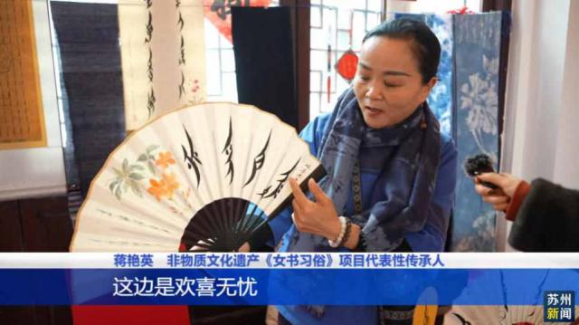 非物质文化遗产《女书习俗》项目代表性传承人蒋艳英介绍,这个是世界上唯一的女性性别专用文字女书,它起源于湖南省永州市江永县,所以也称为江永女书,比如说这把扇子上面,女书它是从右到左、从上往下念,这边是“欢喜无忧”。
