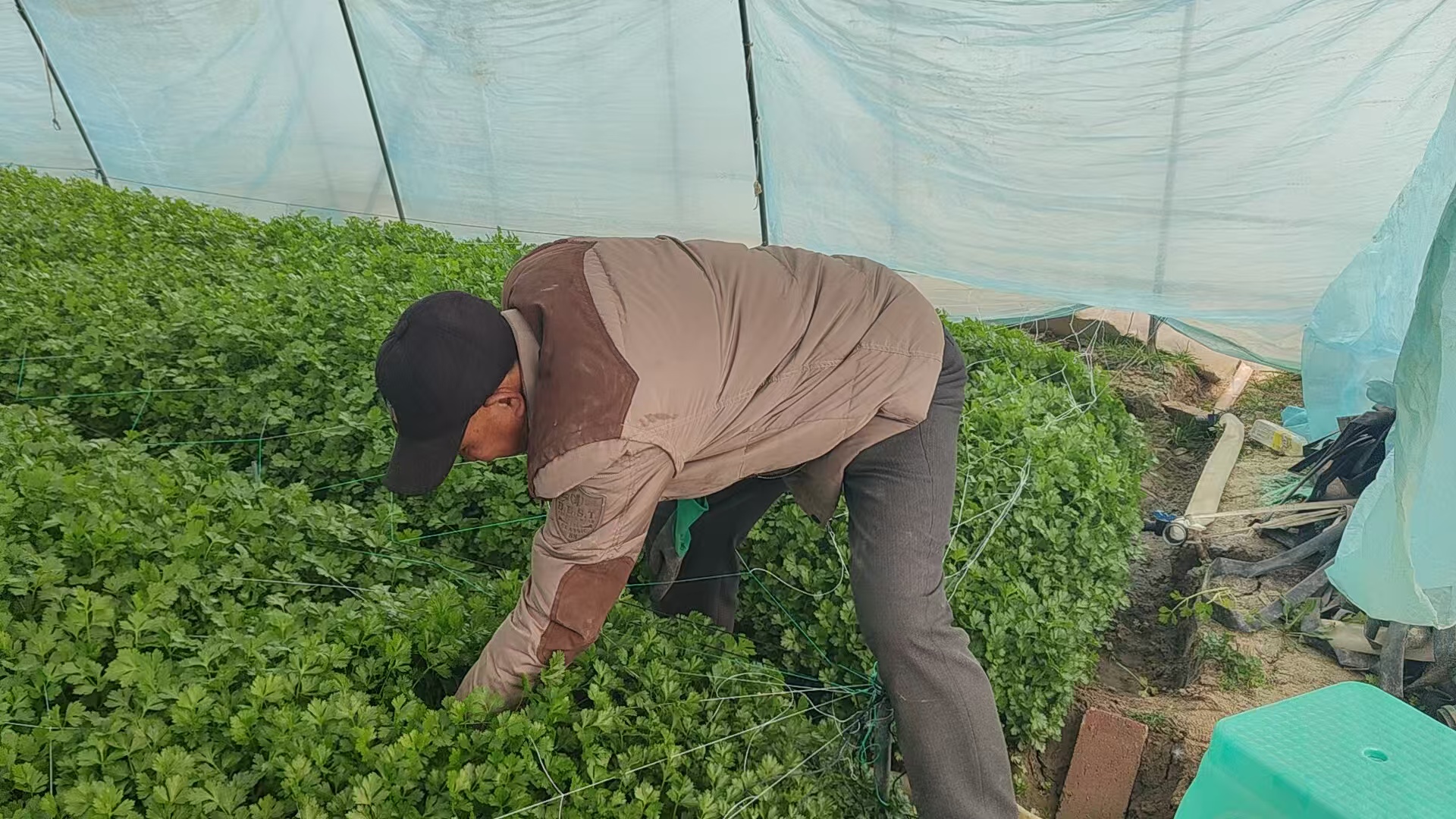 再往前走去,掀开棚帘,绿油油的芹菜映入眼帘,芹菜香味扑鼻而来。记者注意到,芹菜上被一层网封着。“芹菜容易长高,不用网封住它,就容易一边倒,被压到的芹菜卖相不好。”80岁的采摘园技术员韦庚和正拨弄地上的芹菜解释道。他曾是村电工,退休后拿着10亩土地流转的租金,每年1万元左右,来此务工后,收入直接翻倍。