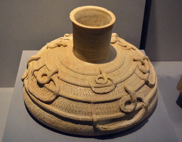 青瓷悬鼓座,鼓座即鼓的底座,是鼓的附属构件。出土于鸿山越国贵族墓,胎色灰白,釉色泛青。鼓座口径达9.4厘米,座径为31.1厘米,高18.8厘米,九蛇盘踞,水波纹饰,尽显古韵。