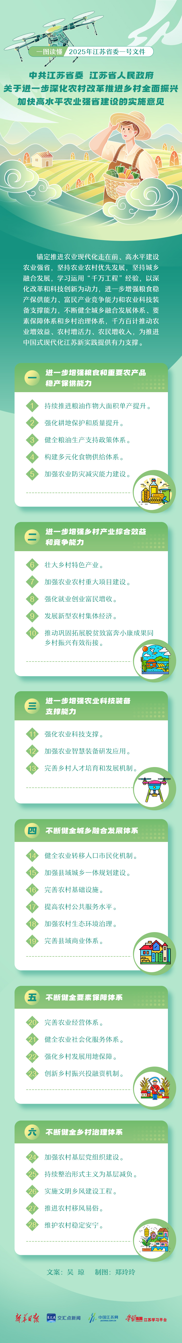 交汇点讯3月3日,新华日报全文刊发2025年江苏省委一号文件,即《中共江苏省委江苏省人民政府关于进一步深化农村改革推进乡村全面振兴加快高水平农业强省建设的实施意见》。新华日报·交汇点记者带您一起速览重点。