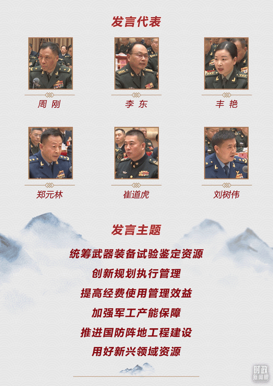 当天,解放军和武警部队代表团6位代表在会上先后发言,分别就统筹武器装备试验鉴定资源、创新规划执行管理、提高经费使用管理效益、加强军工产能保障、推进国防阵地工程建设、用好新兴领域资源等提出意见建议。