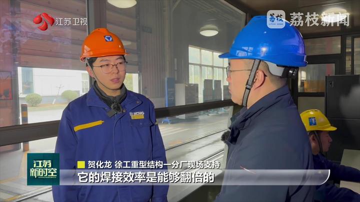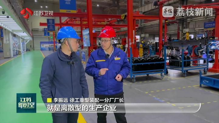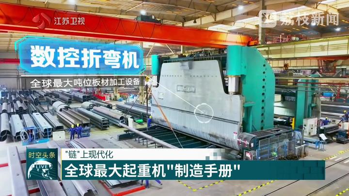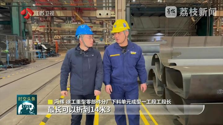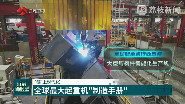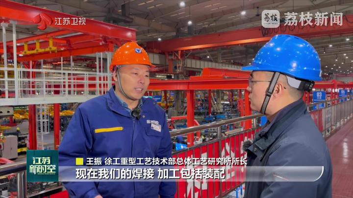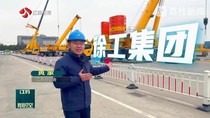 江苏台记者黄蒙说:“这里是徐工。我身后的这片钢铁丛林就是徐工的重型起重机。作为行业龙头,徐工已经连续7次刷新了千吨级轮式起重机的起重纪录。今天我们来到徐工,一起揭秘这些‘超级装备’从钢板到巨擘的诞生密码!”