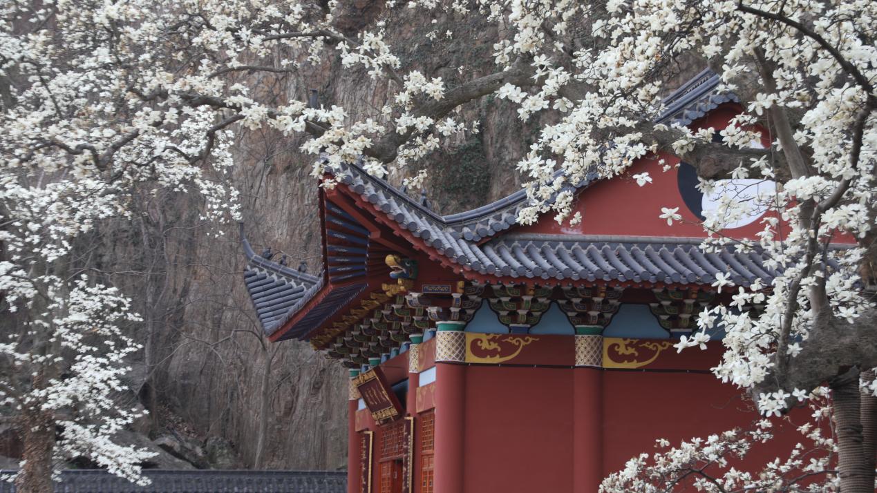 春日阳光下,古老的延福观犹如一幅飘在浮云上的剪影,4株古玉兰树静立院内,其中有两株树龄800余年的“中华玉兰花王”,高达17米,树干粗壮需两人合抱,胸围粗达3.36米和2.39米,是全国树龄最长、树高最高和树围最大的玉兰树。洁白的花朵层层叠叠挂满枝头,盛开的树冠像一大片云朵弥漫在半山之间,蔚为壮观。