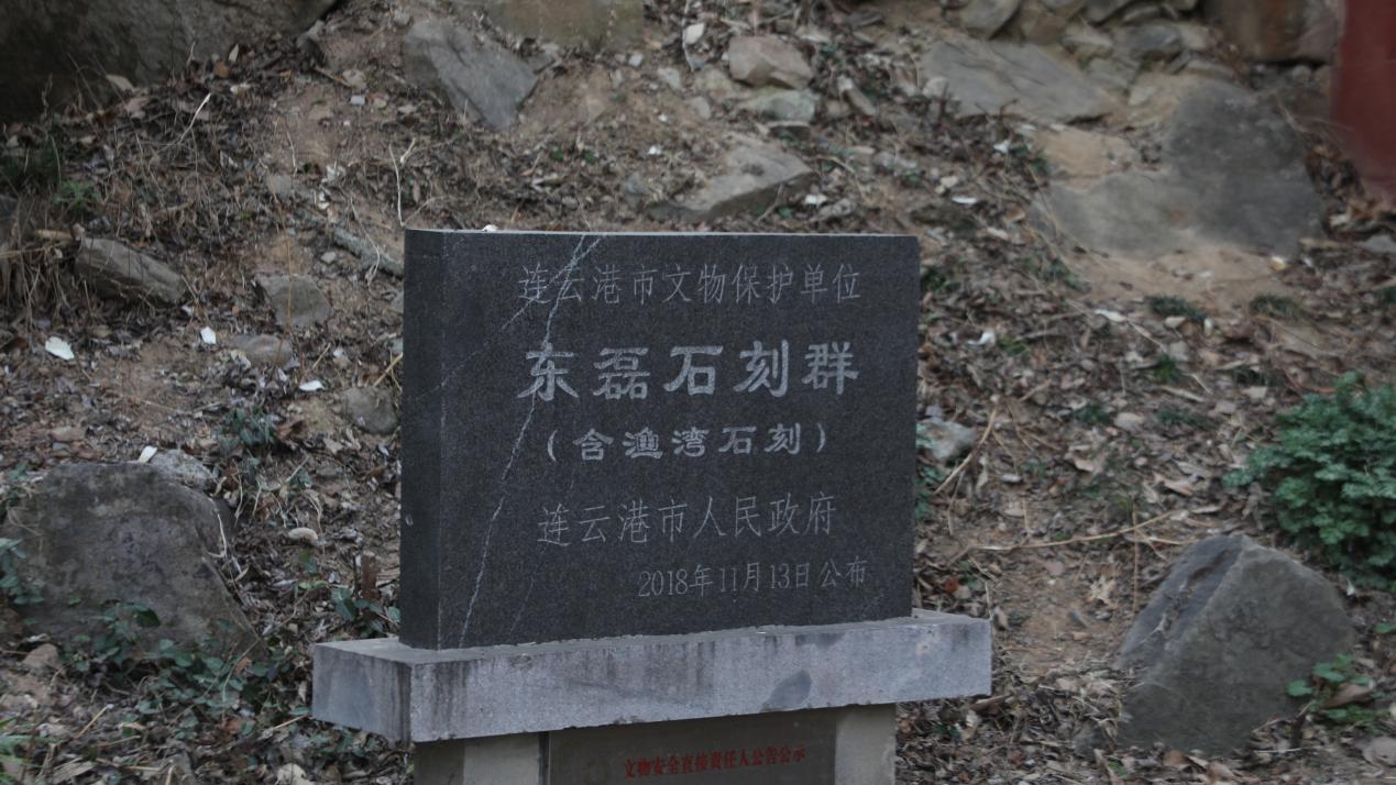 三月末,记者驱车抵达南云台林场东磊分场。在工作人员王三祥的带领下,步行一段石板路,只见林间树木姿态万千,两侧皆为生动山石。行至延福观围墙处,立着一块“东磊石刻群”石碑,在其对面,一块横卧的巨石中间,“登山观海”4个大字苍劲有力。