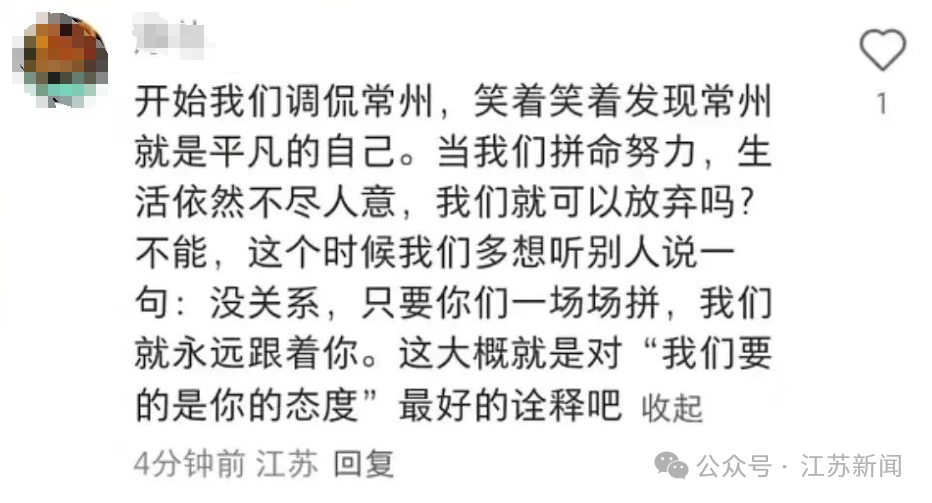 常州对南京的比赛,0:4的结果,没有让球迷对常州队失望,反而激起更多鼓励与期许:“最后一分钟都没有放弃,常州好样的,继续战斗”。