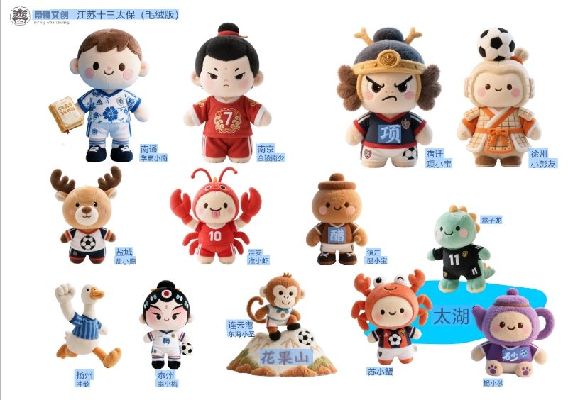 “金陵南少”“学霸小南”“苏小蟹”“锡小砂”“常子龙”“东海小圣”“淮小虾”“项小宝”“盐小鹿”“醋小宝”“冲鹅”“泰小梅”“小彭友”,“江苏十三太保人偶”们个个神气十足。帝腾玩具90后设计师李泽介绍,以南京款人偶为例,我们取名叫“金陵南少”,该款人偶把南京非遗云锦图案与足球服完美融合,让这位“少爷”身着云锦刺绣的红色足球服,尽显金陵古韵与现代足球的碰撞之美。