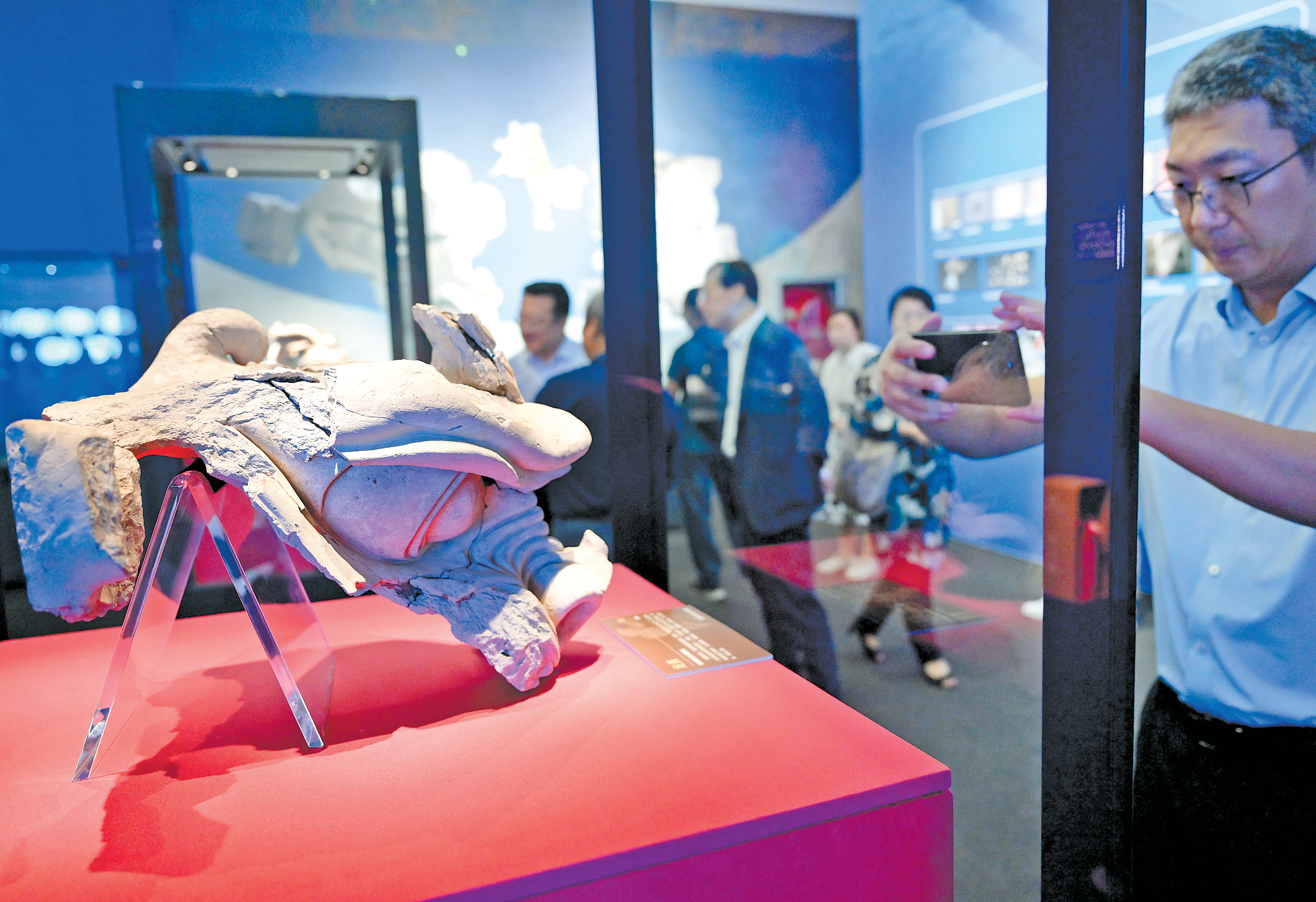 7月28日,观众在欣赏拍摄出土于雄安古州城遗址的唐代龙首。