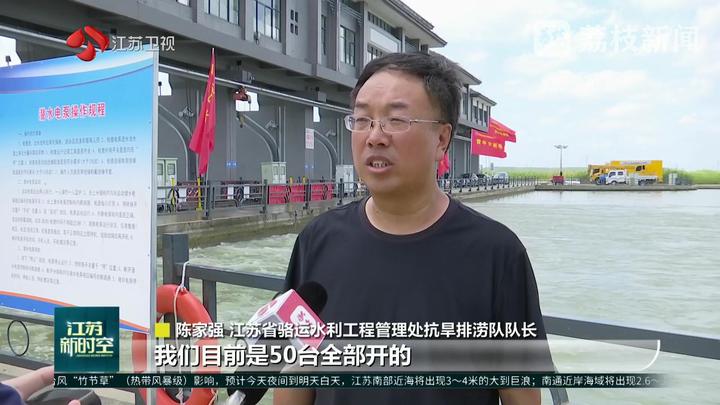 江苏省骆运水利工程管理处抗旱排涝队队长陈家强说:“目前50台全部打开,每台0.25流量,总共12.5流量。一天大概翻110万方水,从24日到现在共翻了255万方水。”