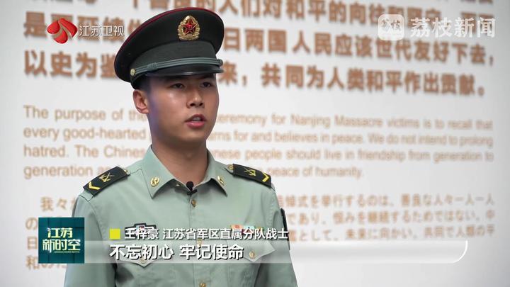 江苏省军区直属分队战士王梓豪说:“作为军人,我们不会让历史重演,不忘初心、牢记使命,时刻瞄准战场苦练打赢本领,为实现建军一百年奋斗目标贡献力量。”