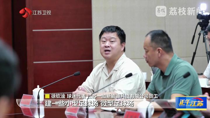 球迷代表、江苏一加新能源科技有限公司员工徐钦淦说:“可以在小区、社区建立一些小型的足球场,微型足球场,就会有很多人参与进来,玩着玩着,他的才能就会展现出来。”