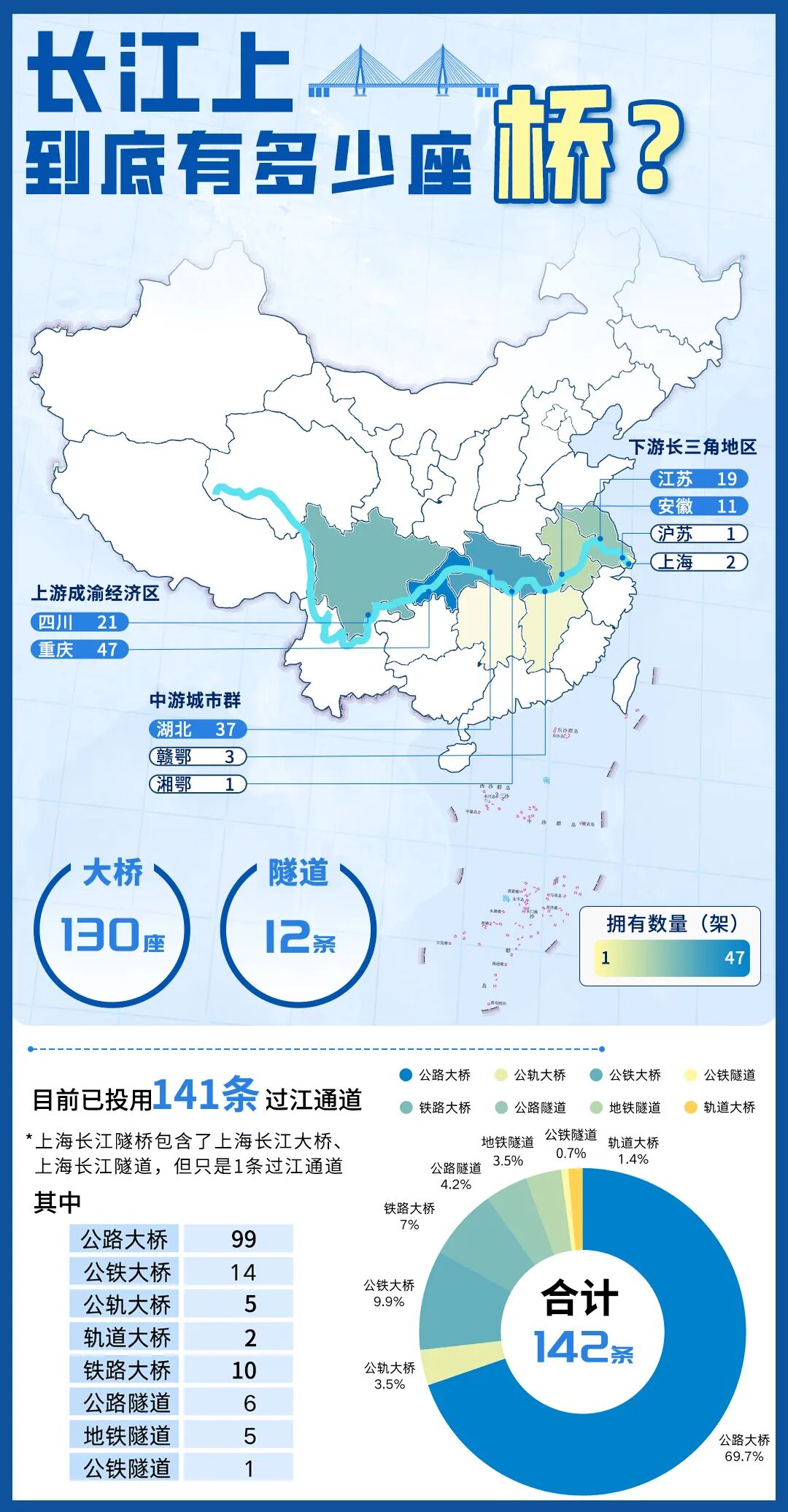 由于上海长江大桥、上海长江隧道实为1条通道(统称为上海长江隧桥),所以目前长江干流段共有141座过江通道在运行中,平均每20.8公里就有一座。