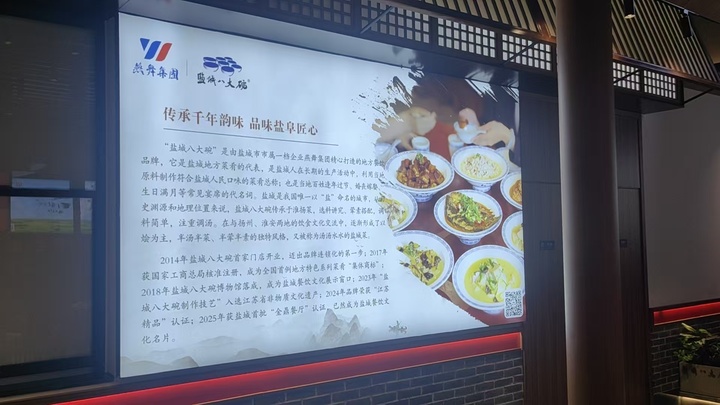 8月,“盐城八大碗”上海首店在杨浦区长阳路的燕舞·东方保利广场开业。“盐城八大碗”是盐城人在长期生活中,利用当地原料烹饪出的符合自身口味的菜肴总称,同时也是盐城百姓逢年过节、婚丧嫁娶、生日满月等常见宴席的代称。它承袭淮扬菜系精髓,形成了以烩为主、半汤半菜、半荤半素的独特风格。新店内盐城景点、特产展销与多媒体互动等元素的设置,生动再现了“八仙桌、八大碗”的民俗宴饮场景。