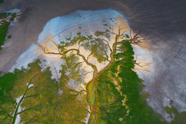 从空中俯瞰盐城海滨,亚洲最大的海岸湿地——黄海湿地呈扇形匍匐铺展,潮汐日夜滋养,滩涂至今仍在“悄悄生长”。这块曾经无名的土地,如今成了生灵的家园,条子泥湿地里,万千候鸟翩跹,野鹿荡深处,暗夜星空璀璨。
