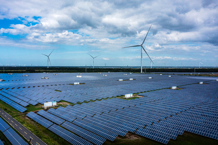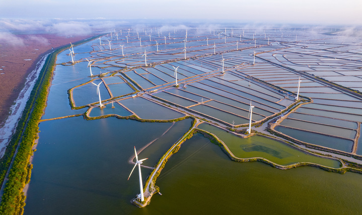 穿行在盐城沿海公路,目之所及是震撼的“能源风景线”。只见银白色风车在海天间轻盈旋转,深蓝色光伏板阵列在阳光下熠熠生辉。
