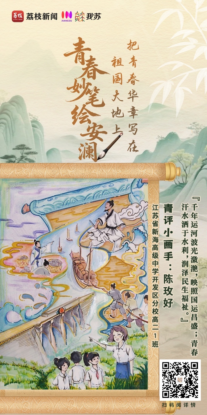 千年水韵,润泽江苏。在这片因水而兴、依水而盛的土地上,治水的智慧始终与为民的初心交相辉映。一代代奋斗者以水为笔、以民为本,将安澜兴水、生态惠民的时代华章,深深写入江苏大地的壮阔图景。青年是祖国的未来,民族复兴的伟业更需青春力量的接续奋斗,来自江苏的高中生们以画笔为媒,将千年治水智慧与新时代水利成就凝于尺素之间。
