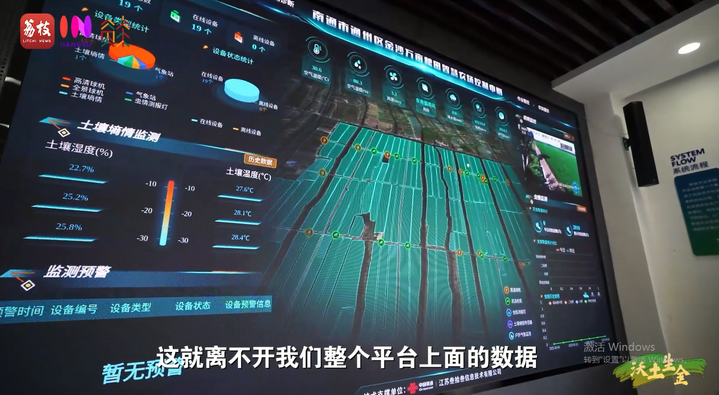 在通州区智慧农场控制中心,江苏农垦驻金沙基地主任黄建正在电子大屏前操作,实时调取土壤湿度、虫情检测等数据。