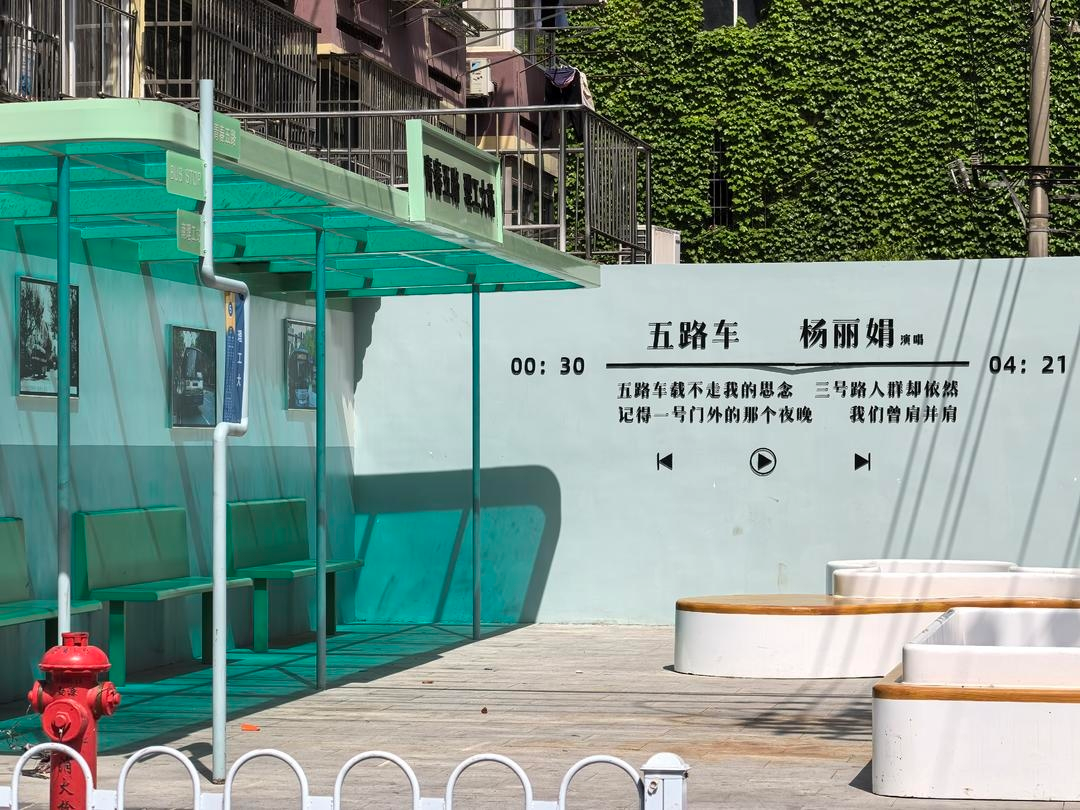 在街巷深处,记者看到一处车站主题公共活动空间,薄荷绿色调的空间氛围,与其后攀援在居民楼外墙的爬山虎“绿墙”相映成趣,这一空间主题正源于“老理工”的回忆——5路车。空间内墙面上,一幅幅5路车的老照片从黑白到彩色,定格时代的印记;在功能定位上,空间也规划了雨棚、座椅等设施,为附近小区居民、街区商户、高校学子提供更丰富的活动、打卡空间。