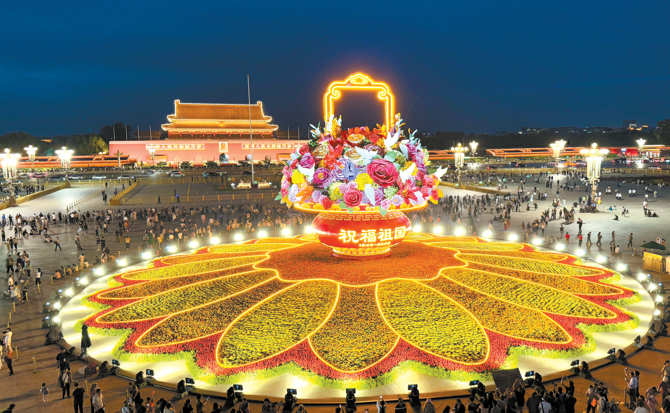 9月25日在天安门广场拍摄的“祝福祖国”大花篮夜景。