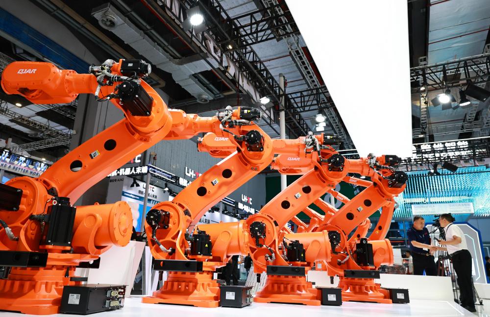 这是2025年9月23日在上海举行的第25届中国国际工业博览会上拍摄的一组大型工业机器人产品。新华社记者方喆摄