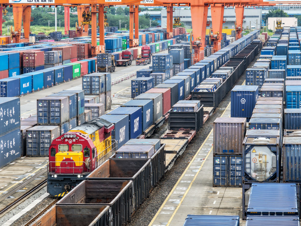 2025年9月8日,满载“重庆造”汽车的中欧班列(成渝)在重庆团结村中心站等待发车(无人机照片)。新华社记者唐奕摄