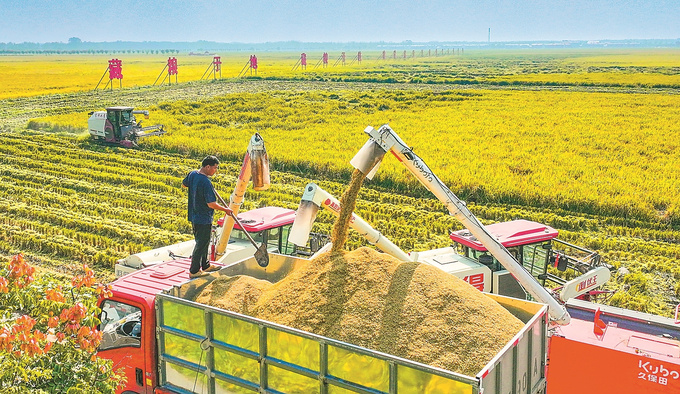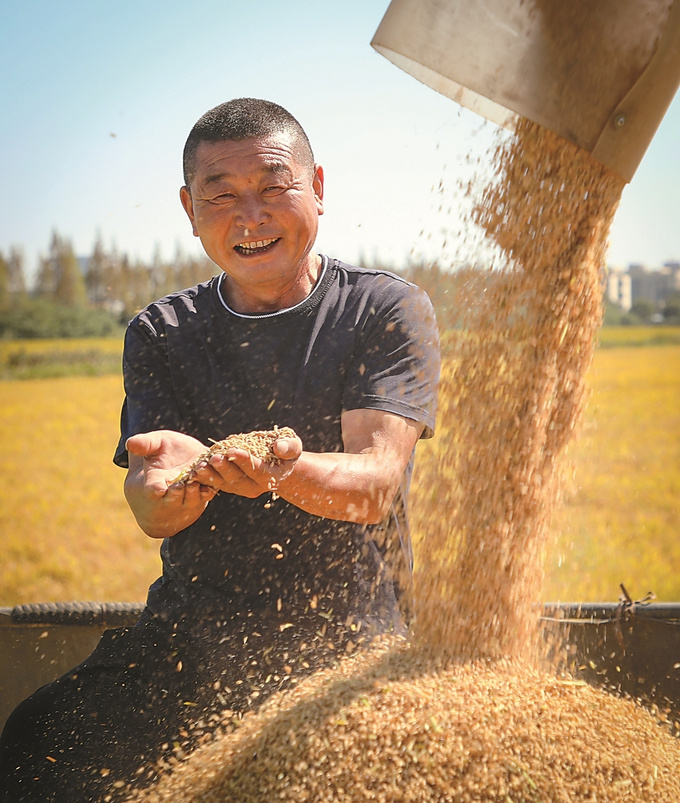金秋的仪征市陈集镇丁桥村,稻浪翻滚、金穗飘香。收割机在田间轰鸣作业,种粮大户董银春站在装满稻谷的车斗旁,捧起一把稻谷,喜悦溢于言表。“今年90亩地平均亩产预计超1300斤。”更让董银春安心的是,他早就不用为卖粮的事发愁了。