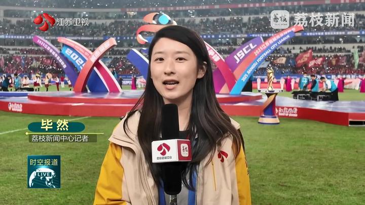 荔枝新闻中心记者毕然说:“这里是2025年江苏省城市足球联赛总决赛的现场。随着终场哨声的吹响,今年,这座‘苏超’联赛冠军奖杯最终被泰州队夺得。这座奖杯,每一道锋芒都映照着江苏十三座城市的星光。它不仅承载着运动员们挥洒的汗水,更镌刻着江苏人民对足球的热爱。”