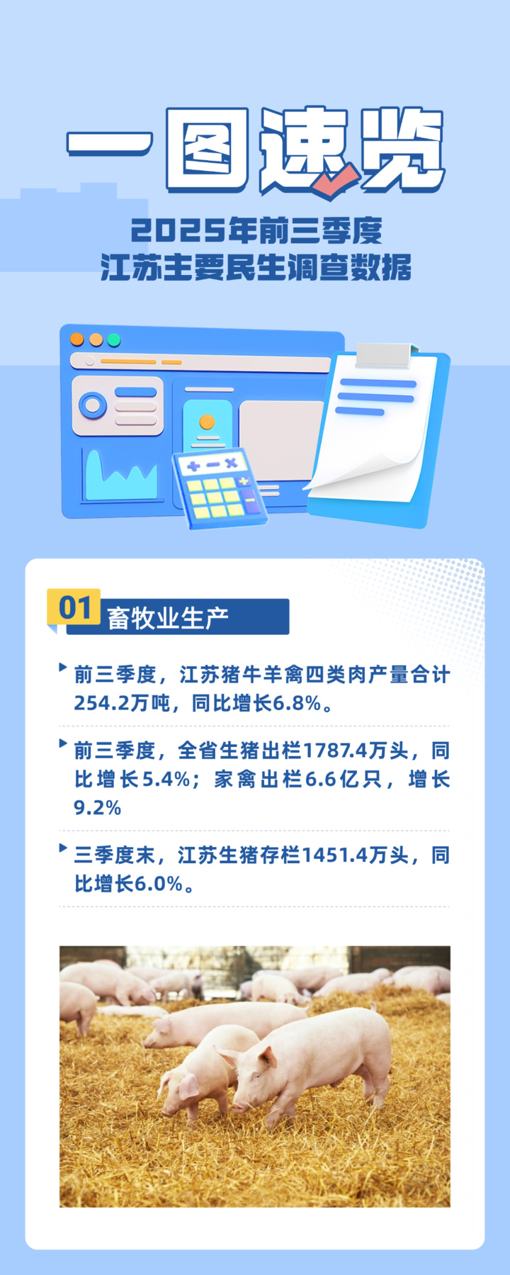 交汇点讯11月3日,新华日报·交汇点记者从国家统计局江苏调查总队获悉,前三季度,江苏民生保障扎实有力,重点领域呈现稳好态势:秋粮生产基础总体良好,旱粮玉米丰收基本定局,水稻苗情长势总体优于去年同期;畜禽生产平稳推进,存出栏量持续增长,为全省民生“基本盘”注入稳稳底气。具体数据如何,请看长图。