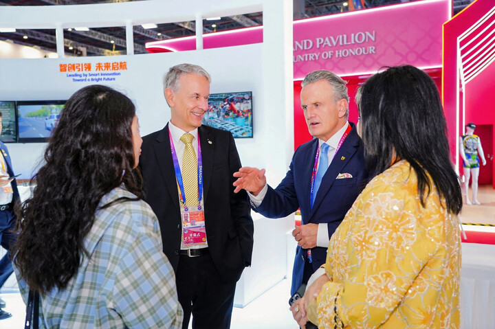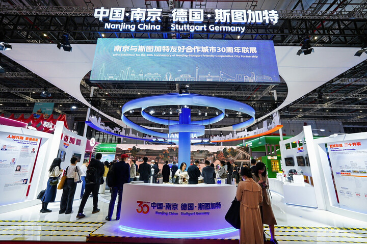 交汇点讯11月5日,第八届中国国际进口博览会在上海国家会展中心盛大开幕。本届进博会国家馆首次设立中外友好城市展区,南京市与德国斯图加特市作为首对参展友城,联袂呈现“南京—斯图加特友好合作城市30周年联展”。展览以“双城匠心·共赢未来”为主题,通过翔实的史料、生动的案例与创新的展示,系统回顾了两市三十年来从产业协同到人文交流的丰硕成果,展现了南京以斯图加特为支点,持续推进对德合作走深走实的稳健步伐与广阔前景。